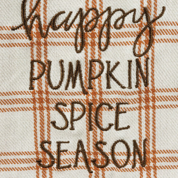 A cotton kitchen towel featuring hand lettered embroidered "Happy Pumpkin Spice Season" sentiment and orange and cream plaid pattern. Machine-washable. 20” x 28”